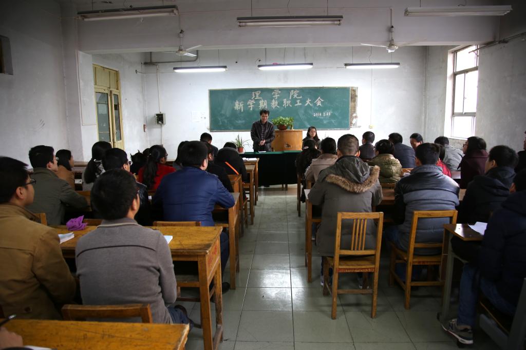 2月27日上午,理学院召开全体教职工大会。该院党总支书记、院长岳忠玉带领大家学习了学校2016年寒假工作会议上党委书记陈平社传达的全省教育工作会议精神,解读了陈万强校长提出的“五个二”发展思路,并安排布置了理学院2016年工作要点。岳忠玉要求广大教师要认真领会陈书记和陈校长的讲话精神,充分认识学校发展中所面临的形势和任务,加大师资队伍建设力度,做好数学类和物理类本科基础课程建设,凝聚学科方向,搭建科研平台,组建科研团队,以学校推行和加强“校院二级管理”为契机,秉承“教授治学、民主办院”的理念,建立健全理学院规章制度,完善激励约束机制,逐步形成“仁人和合、务实尚理、人尽其材、各美其美”的学院文化,切实做好学校各项工作。