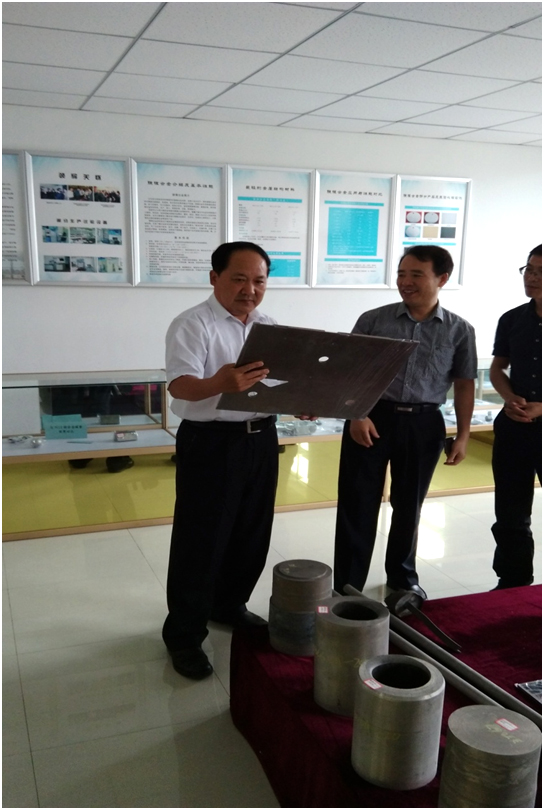 陈万强一行参观了公司产品陈列室,有关人员重点介绍了公司主导产品--镁锂合金材料。镁锂合金材料是目前世界上所知金属材料中密度最低的金属,因其低密度高强度的特殊性能在航空、航天、电子、医疗等等多个领域具有广泛的应用前景,公司配合航空、航天等多家军工单位开展了大量的产品研发和试制工作。公司镁锂合金材料的产品和技术处于国内领先和国际先进水平,具有良好的市场竞争力和广阔的市场前景。