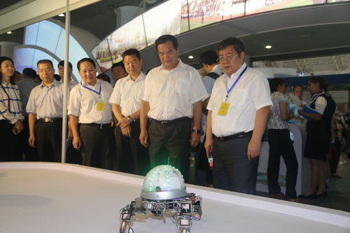 陕西省委高教工委书记李仲为、陕西省教育厅厅长李兴旺与beat365党委书记邓志辉、校长陈万强现场观看beat365机器人表演
