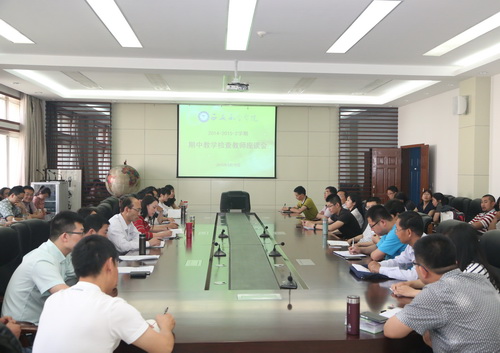 5月15日下午,学校在教学楼九楼会议室召开2014-2015学年第二学期期中教学检查教师座谈会。副校长曹庆年、督导办、教务处、学生处负责人及各院(系、部)教师代表共40人参加了会议。会议由督导办主任刘宁主持。