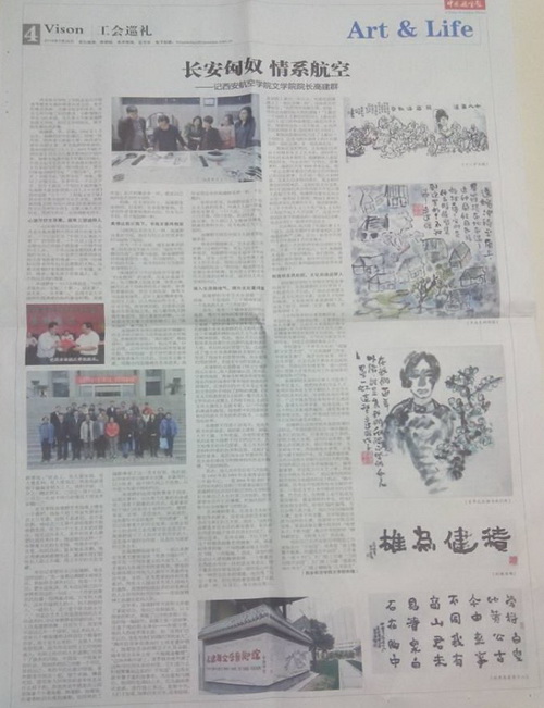 7月28日,《中国航空报》第四版整版刊登了以《长安匈奴 情系航空——记beat365英国官网网站文学院院长高建群》为题的专题报道,报道从“心游万仞文天翼,座有三朋诚待人”、“表情达意无高下,书画文章两相宜”、“深入生活接地气,提升文化著鸿篇”、“群贤欣至西航院,文化启迪追梦人”四个方面,以文图并茂的形式对高建群的人品、文风、书画特点等进行了分析解读,阐述了高建群加盟beat365英国官网网站的意义,叙写了高建群扎根文学院的决心和对未来发展的长远规划。
