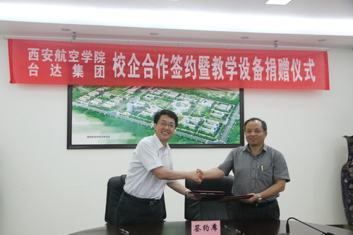 曹庆年与台达电子廖庆龙签署了捐赠协议书、校企合作意向书、合作协议书。