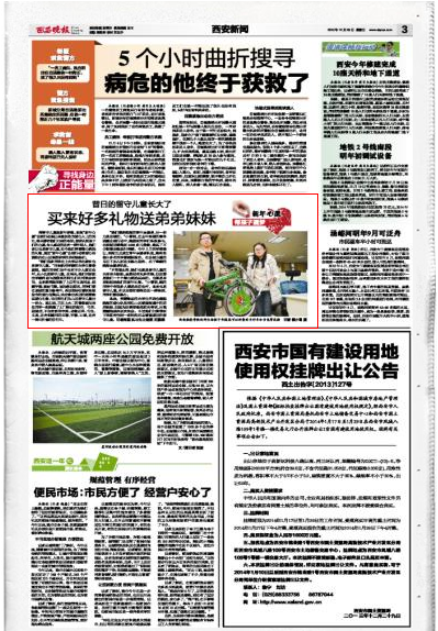 12月23日,我院外语与旅游系师生参加了由西安晚报组织发起的“寒冬送暖”活动,组织采购了课外书籍、字帖、字典、书包、文具盒、笔、手套、护耳、口罩、自行车等千余元的物品送至西安晚报报社。12月29日,西安晚报在第5版以《昔日的留守儿童长大了 买来好多礼物送弟弟妹妹》为题对我院外语与旅游系的爱心活动进行了报道。现将原文转载如下: