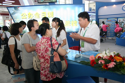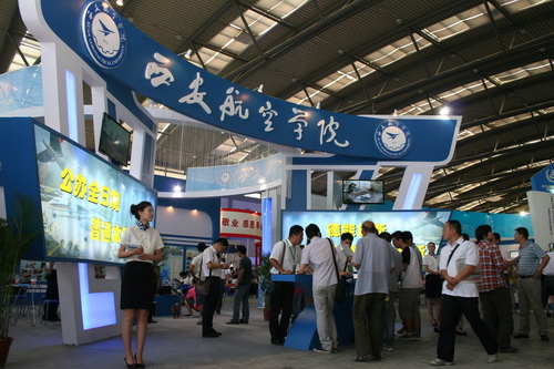 我院展位位于曲江国际会展中心B3区,采用特型展位,其形式布局大气,主题突出,航空特色鲜明。展览由文字图片展示区、数字图像播放区、实物展示区和咨询服务区四个部分组成,全景式展示了近年来我院的办学特色与办学成就。学院独特的设计风格和展位设置获得了考生和家长的赞誉,吸引了众多考生驻足咨询。