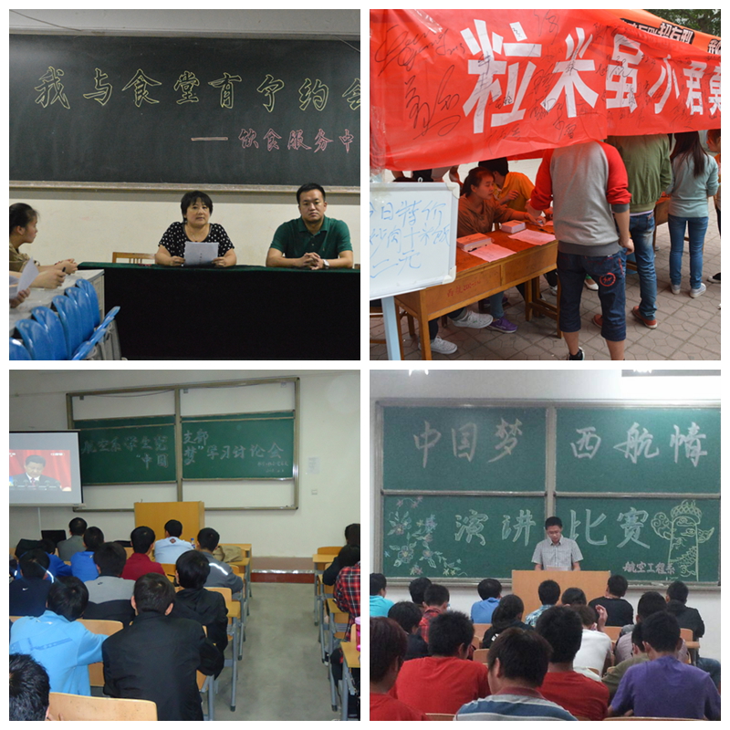 各基层团总支、学生会、社团积极策划开展了“中国梦 西航梦 青春梦”主题团日活动;“我的中国梦”专题讲座、读书征文、演讲比赛;学雷锋“一助一”;“一本好书献母校”、文明宿舍文化创新;绿植领养、“光盘行动”宣传实践;“筑梦进行时”志愿服务等活动,共筑“中国梦”,共建“西航梦”。 (院团委 张新鑫)