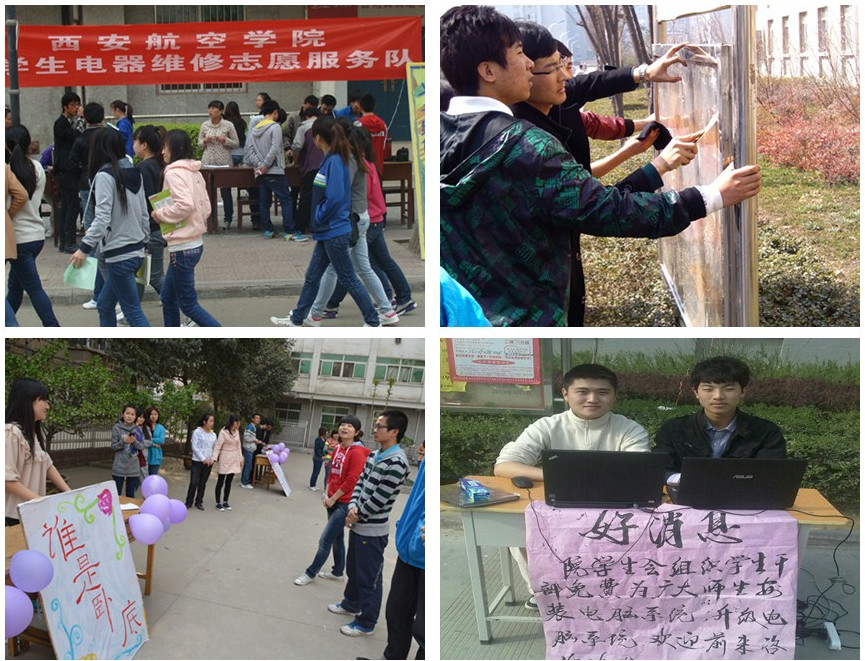 以“向雷锋同志学习”50周年为契机,院团委发出倡议:“弘扬雷锋精神 共建和谐西航”。全院两校区各级团学组织响应号召,广泛宣传,积极动员,通过专场报告会、横幅签名、雷锋事迹图片展、校园美化清洁、关怀慰问空巢老人和留守儿童、义务植树、“缓保堵畅”宣传和家教咨询、故障家电义务维修等多种形式开展学雷锋活动。