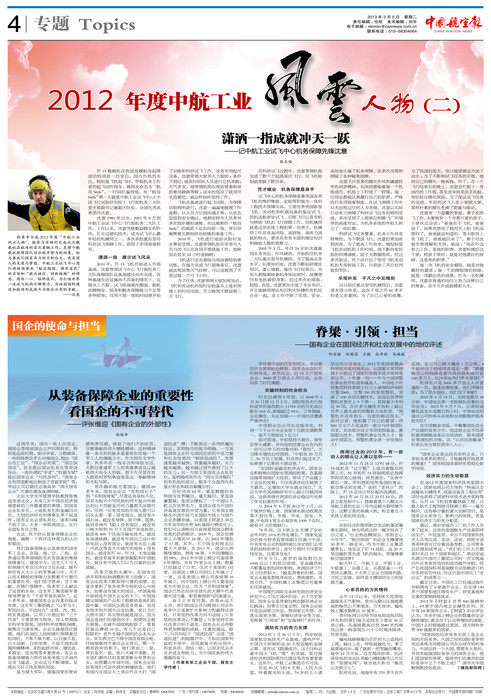 编者按:3月5日,中国航空报以《潇洒一指成就冲天一跃——记中航工业试飞中心机务保障先锋沈意》为题,在第4版对我院杰出校友沈意进行了专题报道。
