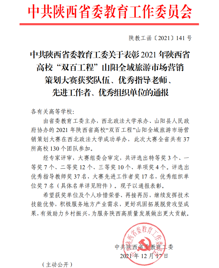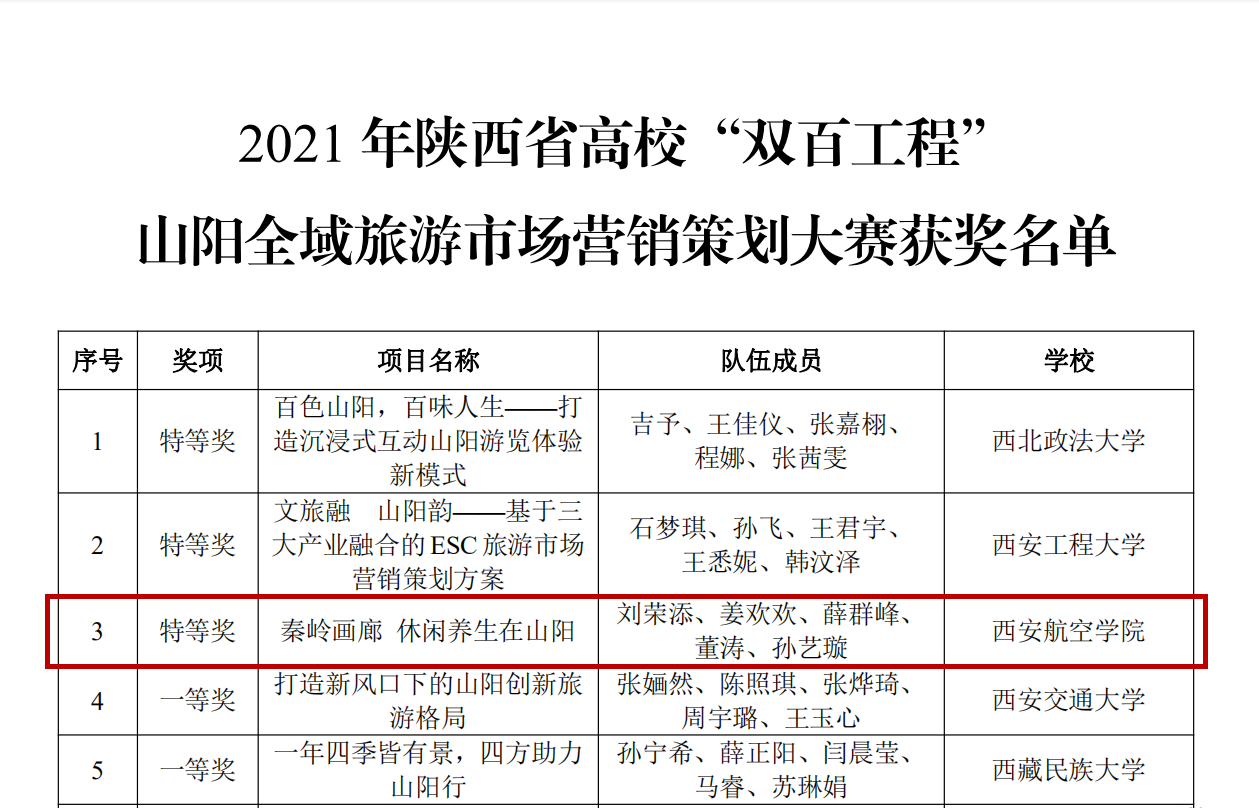近日,2021年陕西省“双百工程”山阳全域旅游市场营销策划大赛线上总决赛结果公布。beat365由经济管理学院张阳老师指导的刘荣添、姜欢欢、薛群峰、董涛、孙艺璇5名同学组成的beat365英国官网网站一队,经过激烈比拼,最终荣获大赛决赛特等奖1项。张阳老师荣获优秀指导教师奖。