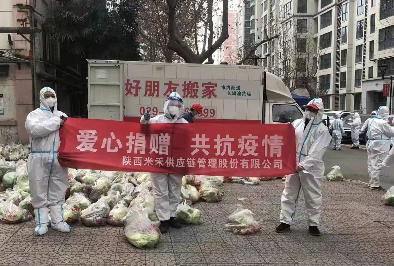 陕西省青年联合会、陕西米禾供应链管理股份有限公司、陕西开瑞建设工程项目管理有限公司、陕西伊园祥食品有限公司、陕西开源招标有限公司、陕西恒星纺织有限公司、陕西雨杉信息科技有限公司、陕西广播电视台乐家购物、中舜国际工程设计有限公司、西安康宁生物科技及有限公司、西安食通餐饮管理有限公司、西安市退役军人服务协会、中舜国际工程设计有限公司、延安大学、青岛凯丰创新控股集团有限公司、凯盛浩丰农业有限公司、郑州育贤斋餐饮管理有限公司、北京春苗慈善基金会、阎良区中医院、磨砂猴便利店等20家单位捐赠了N95口罩、防护服、防护面罩、医用酒精、84消毒液、电动喷雾器等11大类防疫物资,以及蔬菜、水果、牛奶、方便面、面包、矿泉水等8大类生活保障物资,牙膏牙刷、卫生纸等2大类日用物资。