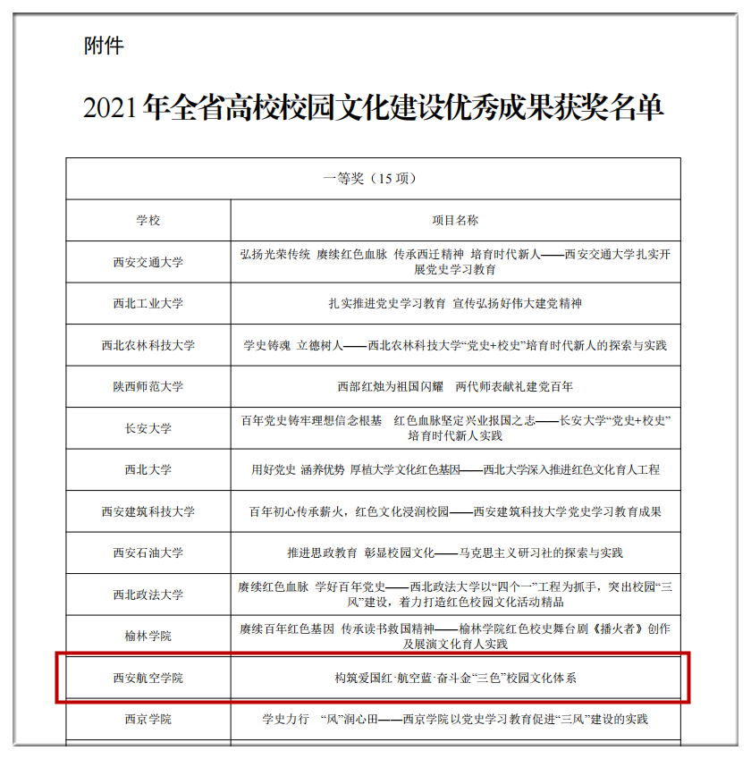 近日,省委教育工委印发《关于表彰2021年全省高校校园文化建设优秀成果的通报》(陕教工函〔2022〕40 号),共评选出一等奖15项、二等奖20项、三等奖25项,beat365申报的《构筑爱国红·航空蓝·奋斗金“三色”校园文化体系》荣获一等奖。这是beat365继2018年、2019年连续荣获一等奖以来,再次获此殊荣。