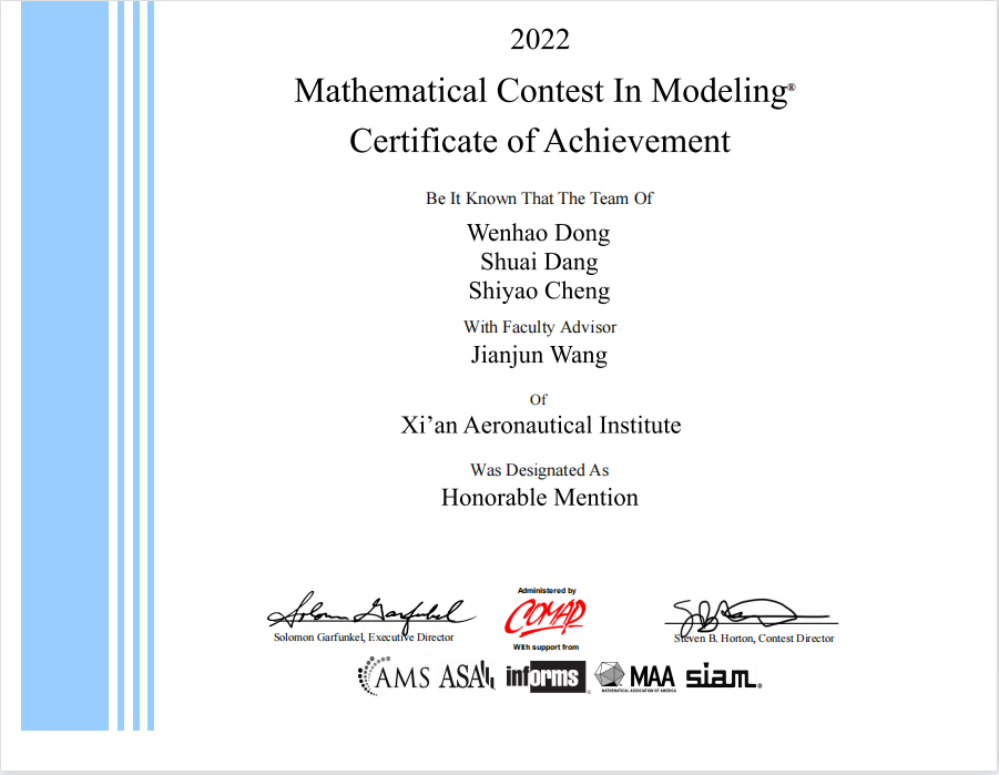 竞赛于北京时间2022年2月18日到22日期间进行。在理学院和网络信息中心老师的指导下,3位同学就指定的问题完成从建立数学模型、运用各种数学方法以及计算机技术进行求解,验证模型的合理性,最终提交出一篇结构清晰、结论明确的英文论文。