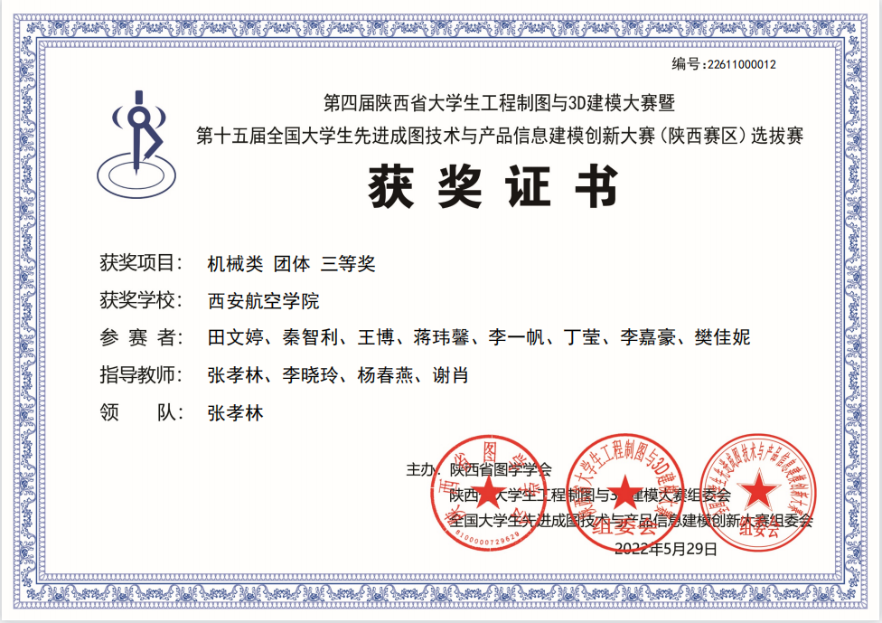 本次大赛由陕西省图学学会、陕西省大学生工程制图及3D建模大赛组委会、全国大学生先进成图技术与产品信息建模创新大赛组委会主办,共有来自西安交通大学、西北工业大学、西安电子科技大学、西北农林科技大学、长安大学等省内30多所高校的57支队伍730余名选手参加了比赛。为落实疫情防控要求,本次大赛采用线上举办、线下交叉监考方式进行。竞赛宗旨是加强学生工程实践能力训练,提高大学生的空间想象力、图学思维素质和工程制图技能,为工科大学生创新能力、创业意识、综合设计能力的培养打好基础。