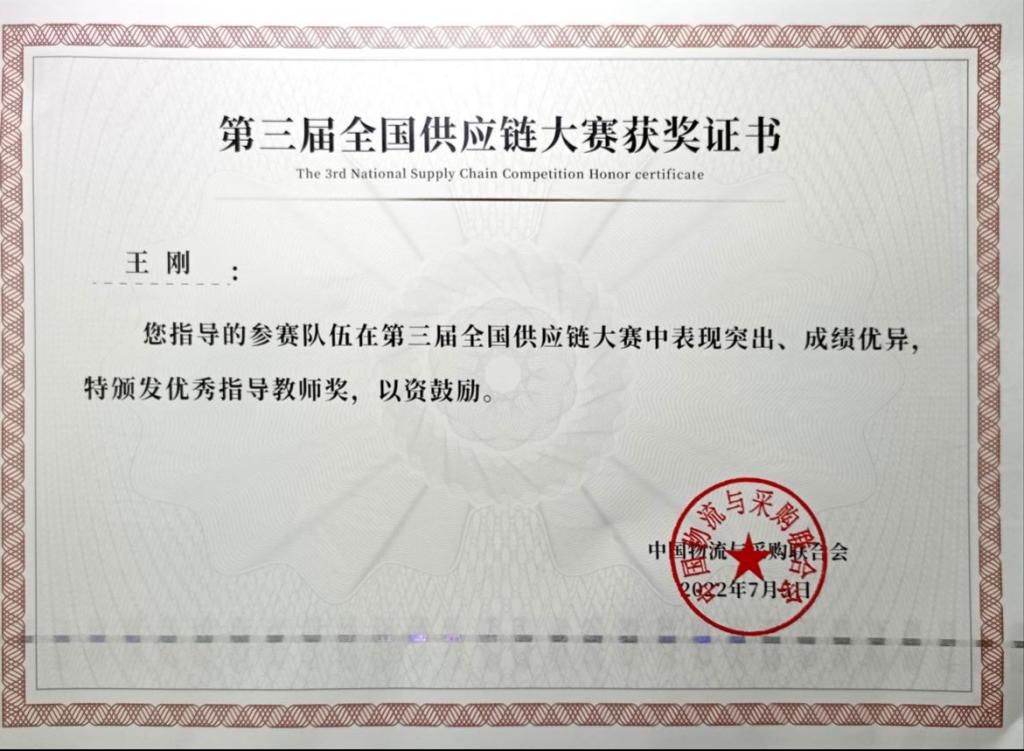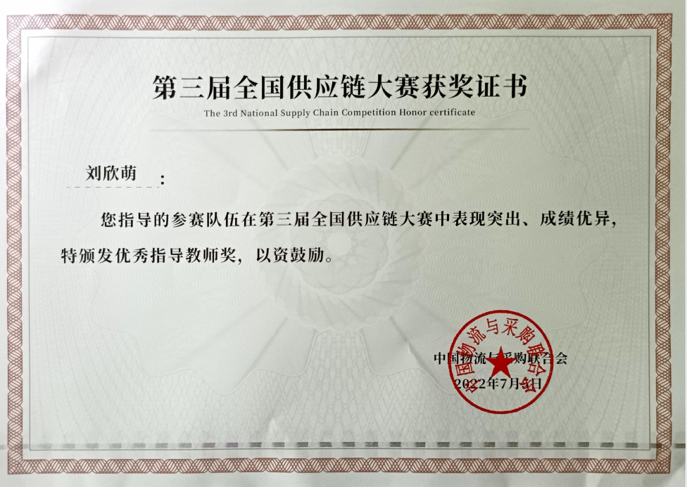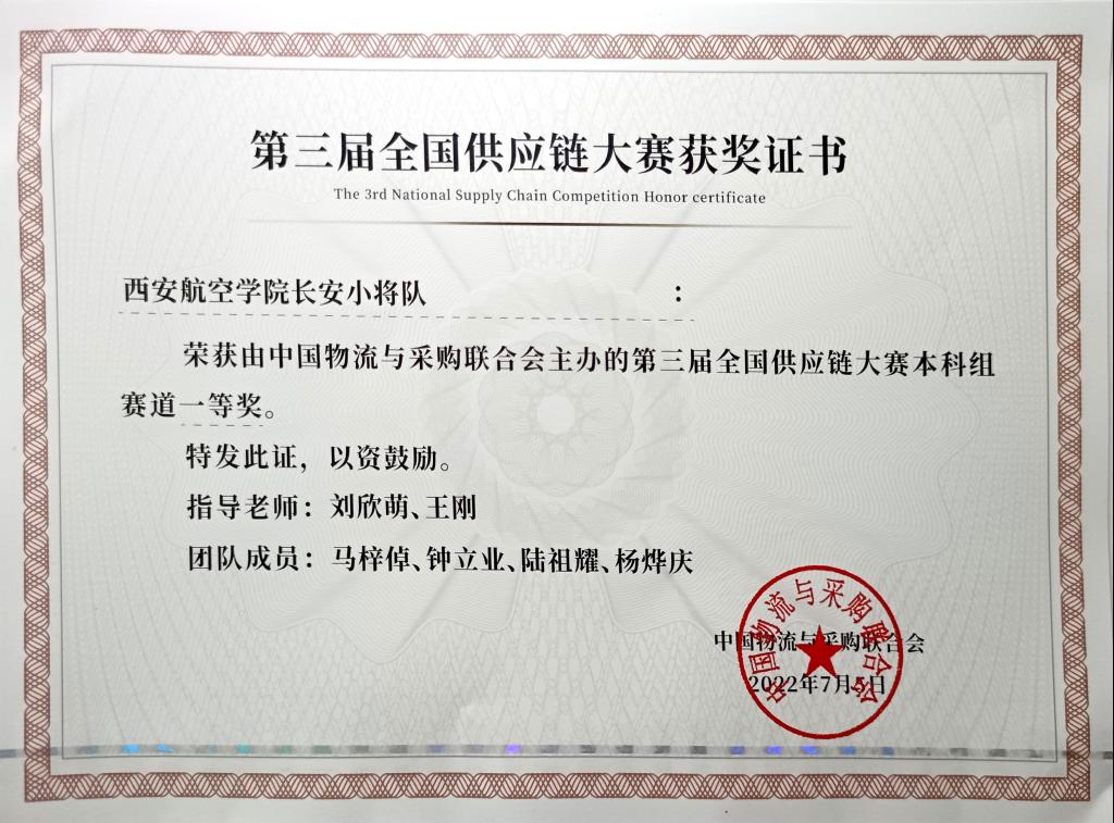 近日,由中国物流与采购联合会主办的第三届全国供应链大赛结果揭晓。beat365由经济管理学院刘欣萌、王刚老师指导的物流管理专业马梓倬,陆祖耀,杨烨庆,钟立业4名同学组成的“长安小将”队,经过激烈角逐,荣获本科组全国一等奖,这是beat365首次荣获该赛项本科组一等奖。两位指导教师荣获优秀指导教师奖。