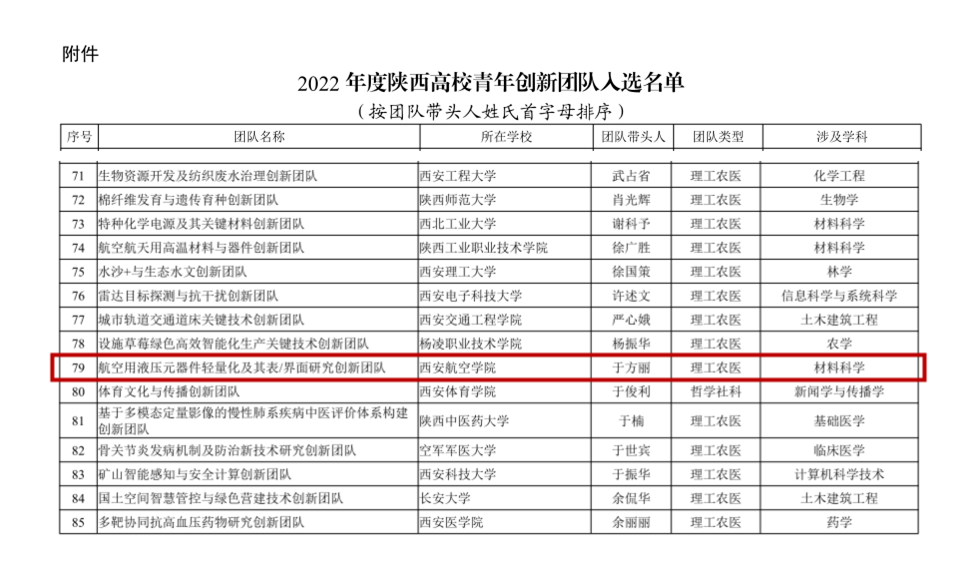 近日,陕西省教育厅发布了《关于公布2022年度陕西高校青年创新团队入选名单的通知》(陕教函〔2022〕943号),beat365材料工程学院于方丽教授带领的“航空用液压元器件轻量化及其表/界面研究创新团队”成功入选2022年度陕西高校青年创新团队,这是beat365团队首次入选陕西高校青年创新团队,实现了学校在该领域的历史性突破。