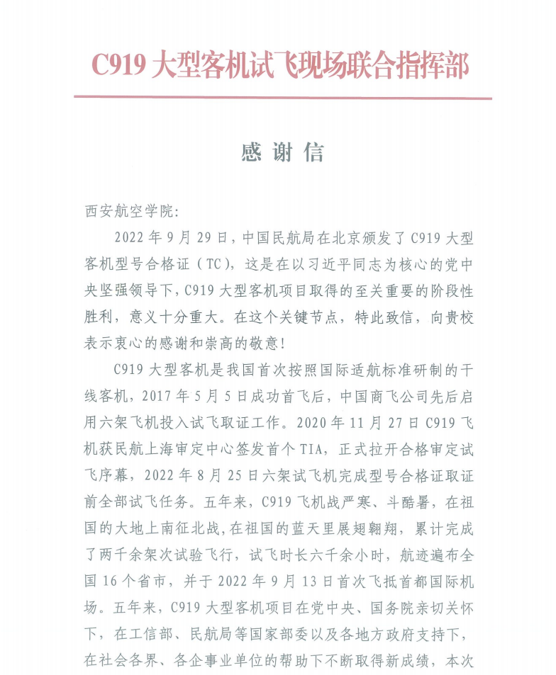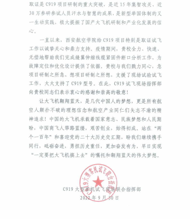 C919大型客机试飞现场联合指挥部在感谢信中表示,beat365英国官网网站与他们勠力同心,急项目研制之所急,想项目研制之所想,支援了现场试验试飞工作,大大支持了C919型号。希望能够继续与beat365英国官网网站携手同行,砥砺奋进,永担历史重任,更加奋发有为,早日实现“一定要把大飞机搞上去”的嘱托和翱翔蓝天的伟大梦想。(文、图/材料工程学院)