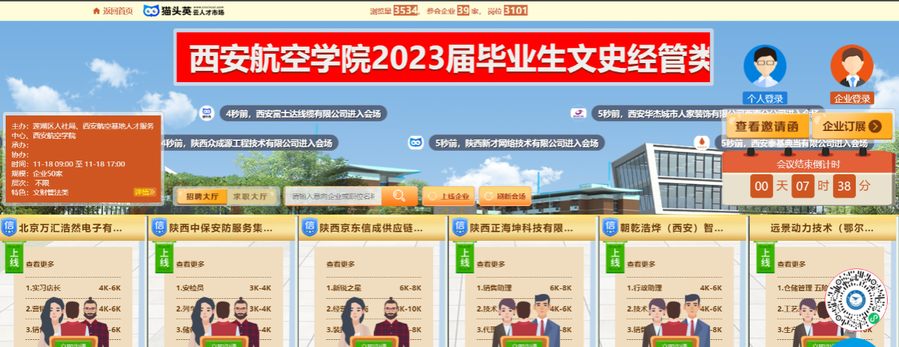 为深入学习贯彻党的二十大精神,落实教育部、省教育厅关于做好2023届毕业生就业创业工作有关部署,11月11日、18日学校与莲湖区人社局、西安航空基地人才服务中心联合举办了2023届毕业生理工类和文史经管类网络双选会。经过精心筛选,理工类网络双选会参会企业93家,其中国企16家、民企57家、外企4家、上市公司10家、中小微企业6家,提供就业岗位7193个。文史经管类网络双选会参会企业39家,其中国企3家,民企30家,外企2家,上市公司2家、中小微企业2家,提供就业岗位3096个。各学院深入动员和指导毕业生精心准备,积极参加招聘求职。两场双选会参会求职毕业生共1100余人,达成就业意向数共1300余人次。