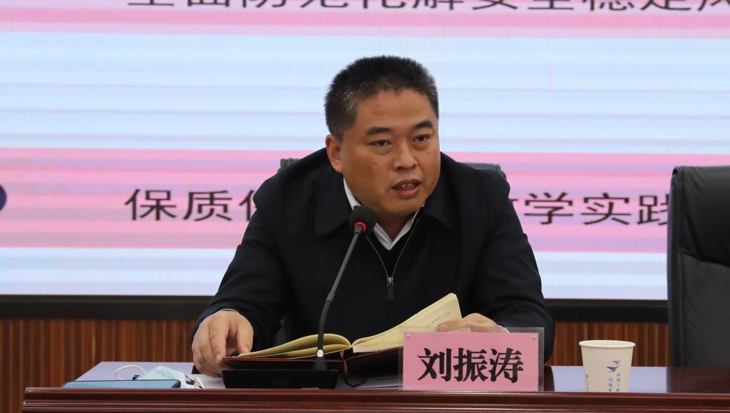 刘振涛要求,要切实把党的二十大精神转化为指导实践推动工作的强大力量,高效统筹学校疫情防控、教育教学和事业发展,深入学习贯彻习近平总书记关于疫情防控工作的重要讲话精神,认真贯彻落实中央和省委决策部署和有关要求,科学精准做好疫情防控工作,压紧压实二级院部主体责任。要加强就业工作规划指导,广泛开拓就业渠道和就业岗位,扎实做好毕业生就业指导、服务和管理工作。要全面防范化解安全稳定风险,加强消防安全、食品安全和实验室安全,维护校园平安和谐。