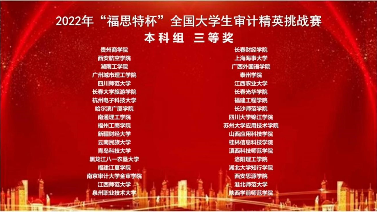 11月26日,由中国审计学会审计教育分会主办,南京审计大学政府审计学院承办的第五届“福思特杯”全国大学生审计精英挑战赛于云端落下帷幕。本次大赛共有来自全国340所院校的390支队伍参加,其中研究生组72支代表队,本科组258支代表队,高职组60支代表队。beat365由经济管理学院潘媛、王玥老师指导的财务管理专业邵睿思、刘栋波、刘映雪三位同学组成的参赛队,经过激烈角逐,最终荣获全国本科组三等奖一项。