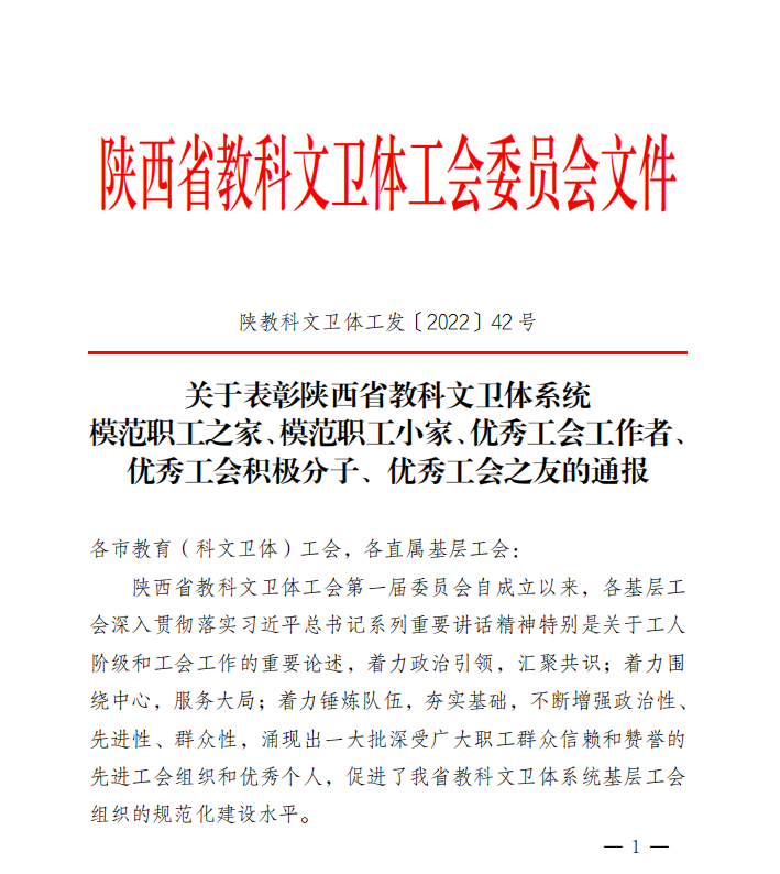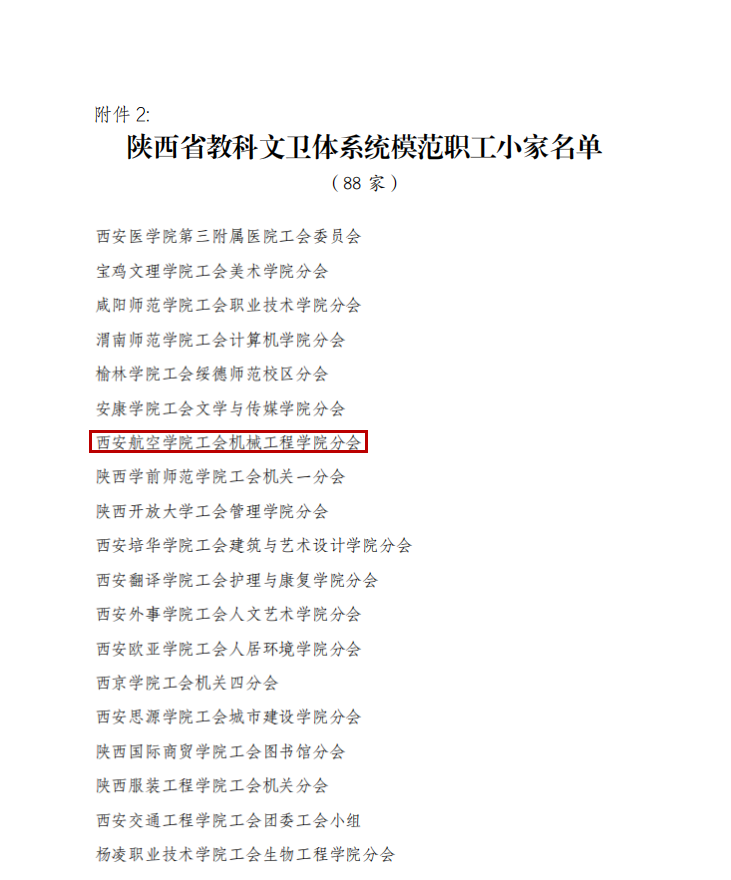 为进一步激发基层工会活力,发挥先进典型的示范引领作用,团结动员全省教科文卫体系统广大职工为推动新时代陕西高质量发展作出更大的贡献,12月2日,陕西省教科文卫体工会委员会印发了《关于表彰陕西省教科文卫体系统模范职工之家、模范职工小家、优秀工会工作者、优秀工会积极分子、优秀工会之友的通报》(陕教科文卫体工发〔2022〕42 号),经自查申报、初审推荐、复核审定等程序,beat365机械工程学院分会荣获全省教科文卫体系统”模范职工小家”荣誉称号。