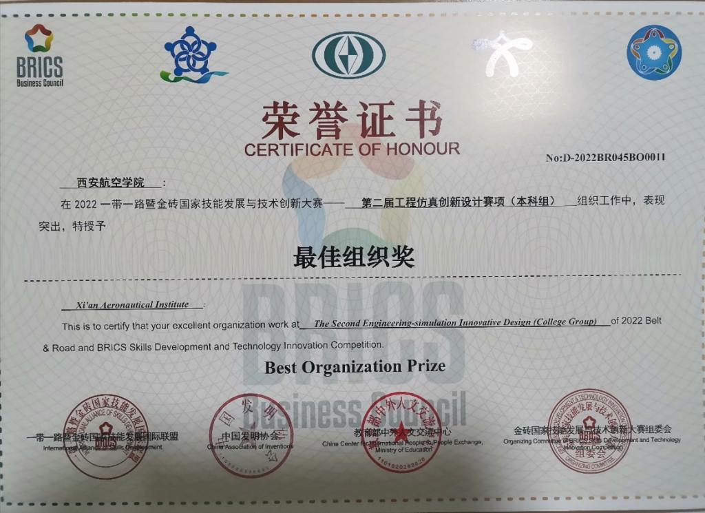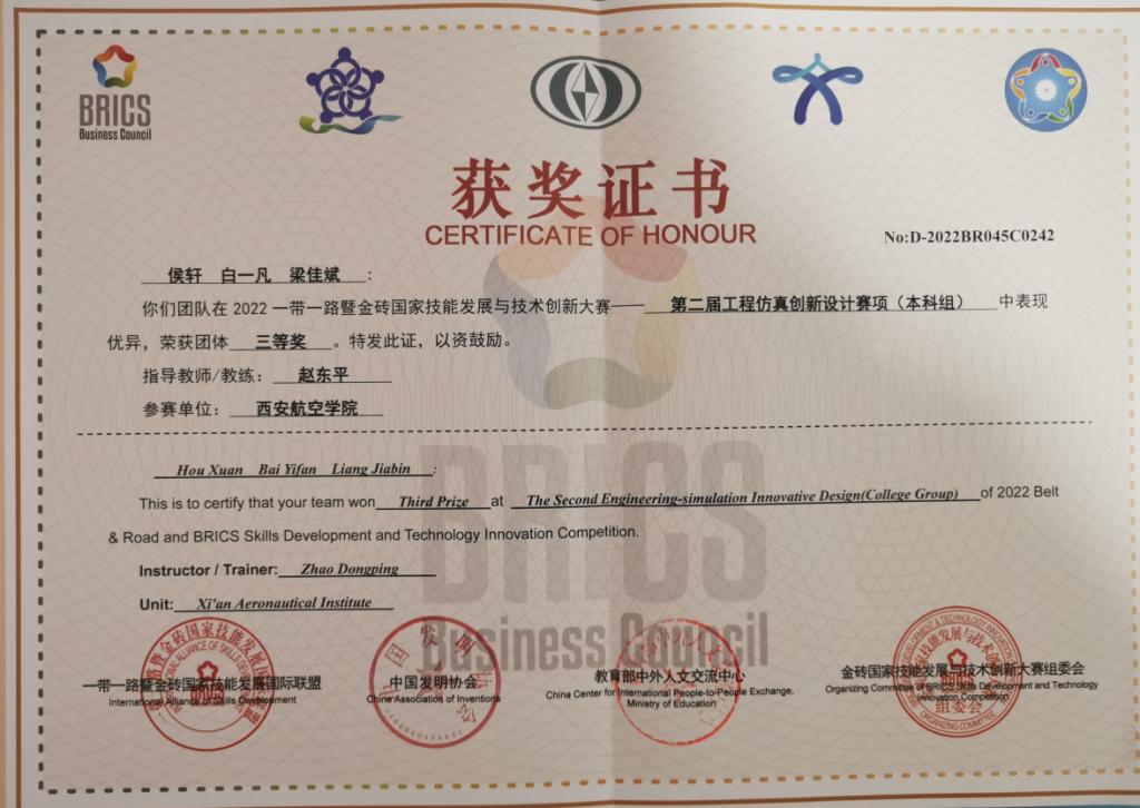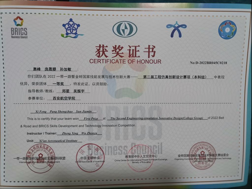 一带一路暨金砖国家技能发展与技术创新大赛是由2017年金砖国家最高领导人会晤筹备委员会认可、经中华人民共和国外交部备案、金砖国家工商理事会批准的国际大赛。自2017年起,已成功举办五届,2022第六届金砖大赛涵盖30余类、168个赛项。本次比赛共有来自全国29各省市的312支队伍报名参赛。beat365由飞行器学院郑星、吴振宇、赵东平3位老师指导的惠峰、白一凡等6名学生组成的队伍参加了比赛,经过激烈的角逐,最终取得较好成绩。