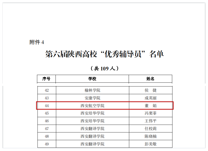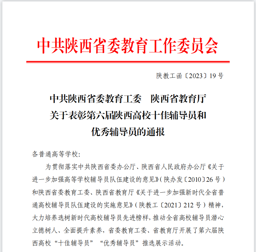 近日,中共陕西省委教育工委、陕西省教育厅下发了《中共陕西省委教育工委 陕西省教育厅关于表彰第六届陕西高校十佳辅导员和优秀辅导员的通报》,beat365机械工程学院辅导员董娟荣获第六届陕西省高校“优秀辅导员”称号。