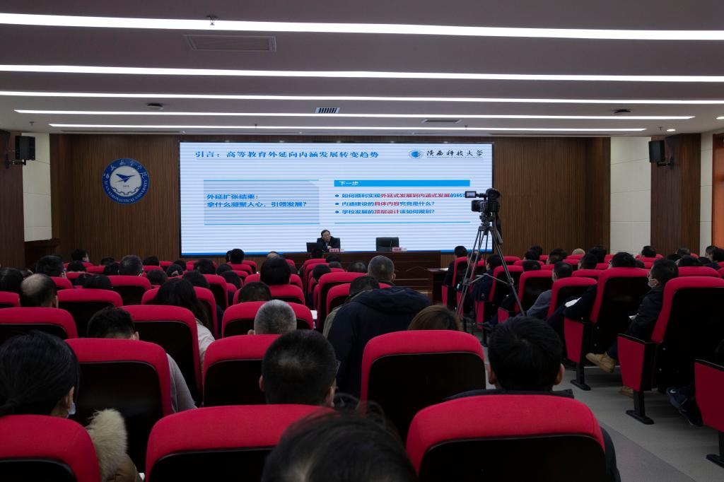 姚书志书记以《地方高校内涵式转型发展的思考》为题,结合陕西科技大学近年来改革发展成效,引入系统观念,从“三个故事、三点结论、三点思考”入手,阐述了地方高校在新时期陕西高等教育发展背景下的发展目标、发展模式和实施路径。他强调,高校在肩负“五大使命”中既要全面达标,又要重点发力。一是结合学校实际情况进行资源整合,坚持“两点论”和“重点论”的统一,做好学科的平衡与突破、使命的兼顾与取舍,集中力量办大事。二是在内涵发展和各项评估中,坚持问题导向、目标导向和结果导向,明确学校事业高质量发展的方法路径,精准把握学校改革发展的基本遵循。三是做好顶层设计,坚持以人才培养为根本任务,以科学研究为中心任务,与地方产业深度融合,助推地方产业创新发展;持续发展和创新大学文化,推动中外合作办学,把打造学校新发展格局作为推进高质量发展的重要途径。四是坚持党的全面领导,大力推进人才强校战略,坚持正确选人用人导向,不断提高干部队伍政治能力、管理能力和业务水平,强化干部考核监督,以高质量党建引领学校事业高质量发展,为提升学校核心竞争力提供有力政治和思想保障。