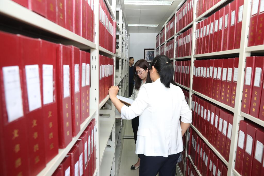 会后,检查组现场查阅了支撑材料,实地考察了档案室办公室、库房建设、档案保管利用、信息化建设等情况。