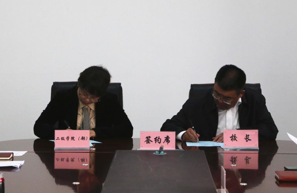 刘振涛作总结讲话,他指出,举办这样郑重庄严的目标任务签订仪式,说明学校对这项工作是特别认真、特别严肃。他强调,对照学校“十四五”发展目标,尽管目标任务很艰巨,但既然决定了我们就一定要严格执行,要通过目标责任考核,切实提高人才培养质量,切实对学生负责。学校目前正在推动多项改革,要向改革要动力、要发展,通过建设星级服务型校园、搭建师生网络服务平台等举措,倒逼学校内部管理体制的改革。各二级学院(部)内部也要大胆进行改革,要针对学风、教风、教学质量、业务水平、工作责任心等方面制定出配套的考核政策,切实将压力层层传导到每一位教职员工,学校也将在政策上给予大力支持。他对二级学院(部)提出了三点要求:一是院长要经常主动向总支书记通报业务工作,党总支书记要经常主动向院长通报党建工作,党政要亲密无间,团结一心做好工作;二是党总支书记要放开手脚,转变观念,大胆了解、参与业务工作,要清楚党建工作与党务工作的区别,团结队伍,凝聚人心,将党建工作融入业务工作,切实起到党建对业务的引领与保障作用;三是业务工作要多听取党总支书记的意见建议,确保教师队伍的师德师风、政治原则方向不出错、不跑偏。