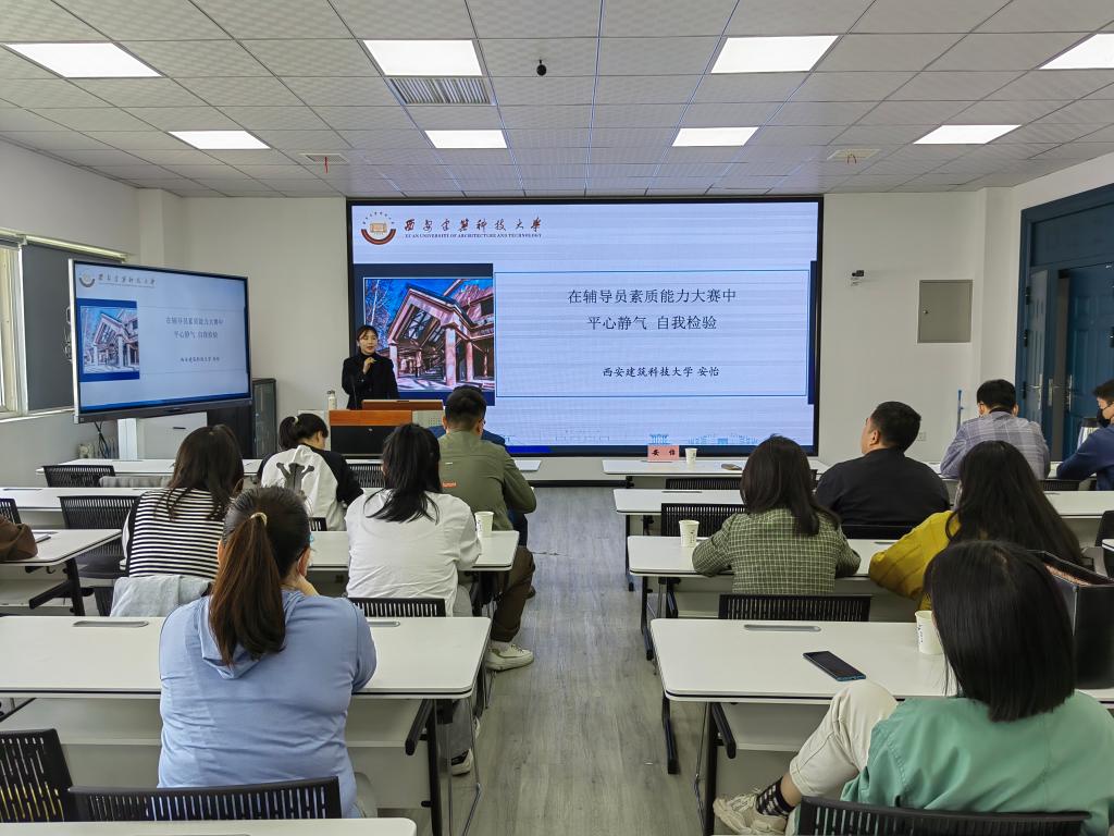 为做好学校第六届辅导员素质能力大赛备赛准备工作。5月11日,beat365第十一期“翱翔之翼”学工论坛邀请全国高校辅导员素质能力提升骨干训练营“特别表现奖”、陕西高校第八届辅导员素质能力大赛一等奖获得者、西安建筑科技大学辅导员安怡作《在辅导员素质能力大赛中平心静气、自我检验》专题培训,beat365全体一线专职辅导员参加培训。
