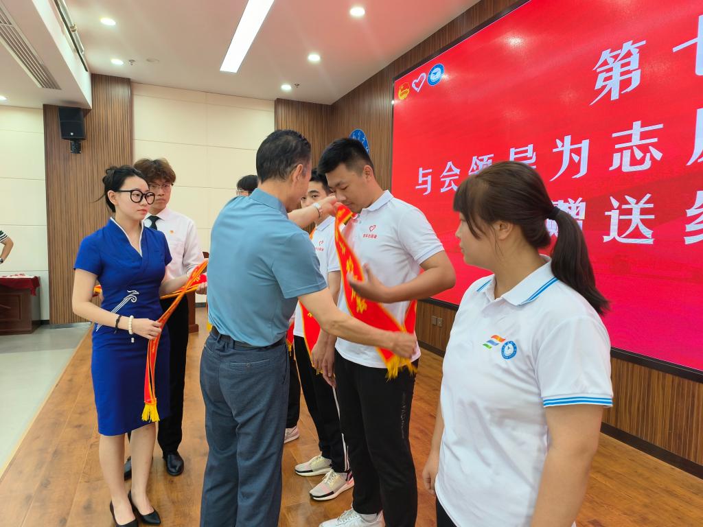 张昭逐一为9名同学佩戴绶带。与会领导一同为志愿者们送上了书籍和纪念品,表达了母校对志愿者们的真诚祝福。