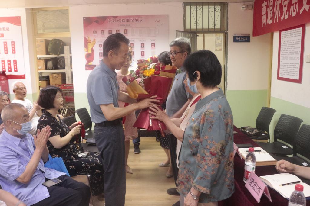 张昭代表学校向到场的姬秋凤、路娟、杨高民三位老党员颁发纪念章并送上鲜花表示祝贺。