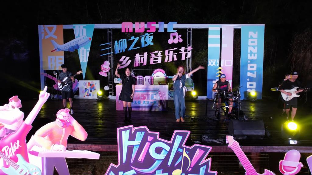 夜幕降临,双河口镇灯火通明,在三柳村的朱小鹮露营地举办的“古镇之夜 清凉一夏”音乐节热闹非凡,同学们尽情享受着青春的旋律,跟随跳动的音符放松心情。