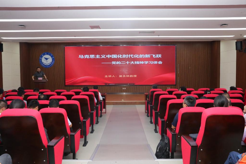 夏永林教授结合多年一线思想教育工作的切身感受和9个月所学所感、所思所悟,站位高远、深入浅出地为师生解读了党的二十大报告以及如何“三进”工作。夏永林教授表示,党的二十大报告从16个方面总结概括了十年来的伟大变革,习近平新时代中国特色社会主义思想是马克思主义时代化的产物,“中国式现代化”是新时代新征程中国共产党的使命任务,全面建设社会主义现代化国家、全面推进中华民族伟大复兴,关键在党,关键在党要管党、全面从严治党。最后,夏永林教授结合自己工作经历,切实提出党的二十大精神进教材、进课堂、进头脑的关键点和方法。