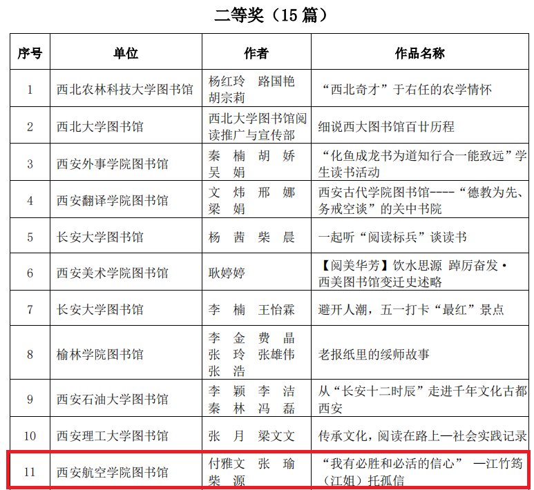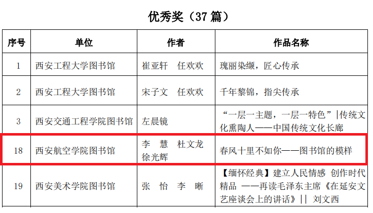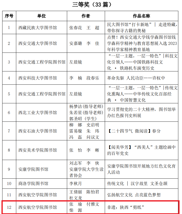 近日,陕西省普通本科高校图书情报工作委员会举办的“让文化共传承,让育人更生动”公众号推文展示与评比活动落幕。beat365图书馆申报的《“我有必胜和必活的信心” —江竹筠(江姐)托孤信》《弘扬航空文化 点亮蓝色梦想》《非遗:陕西“剪纸”》、《春风十里不如你——图书馆的模样》分别荣获二等奖、三等奖、优秀奖。