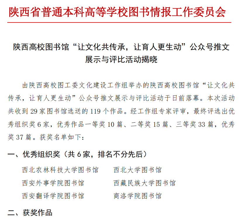 陕西省普通本科高校图书情报工作委员会是在陕西省教育厅的领导下,对全省高等院校图书情报事业进行协调、咨询、研究和业务指导的工作机构。今后,图书馆将继续策划和设计更多的推文,助力学校文化育人。积极参加陕西省普通本科高校图工委的各项活动,加强与各成员馆的联系,进一步提升beat365图书馆影响力。(文、图/图书馆 柴源 审核/赵建涛)