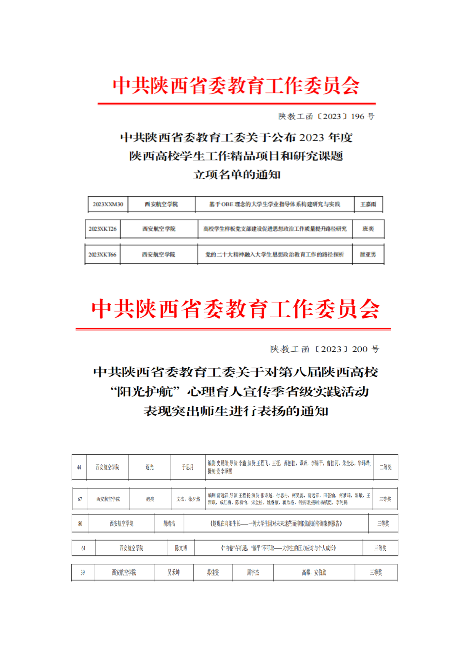 近日,中共陕西省委教育工委公布了2023年度陕西高校学生工作精品项目、研究课题立项名单和第八届陕西高校“阳光护航”心理育人宣传季省级实践活动获奖单位与个人名单。