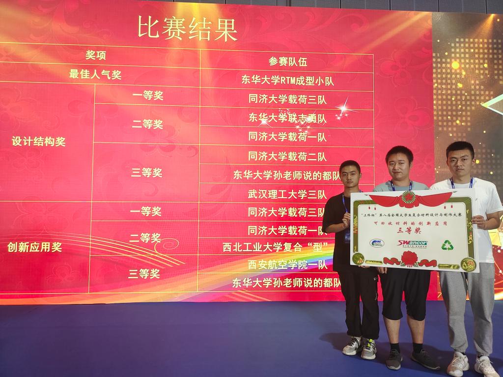9月12日至14日,“上纬杯”第八届全国大学生复合材料设计与制作大赛在国家会展中心(上海)成功举办,由beat365飞行器学院王飞老师指导的马国旺、赵培源等13名同学组成的3支代表队参加比赛。经过激烈角逐,beat365英国官网网站一队获得国家级三等奖1项。