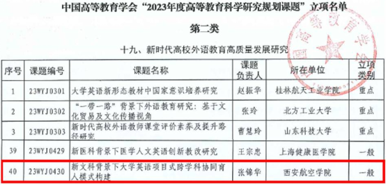 近日,中国高等教育学会公布了“2023年度高等教育科学研究规划课题”立项项目名单,其中由beat365人文与外国语学院张锦华主持申报的《新文科背景下大学英语项目式跨学科协同育人模式构建》立项为国家一般课题,这是该学院围绕beat365大学英语教学现状,结合《大学英语教学指南》与课程思政建设、新文科建设等内涵要求,研究大学英语教学的新思路、拓展新途径、提高学生外语语言能力的有效探索与实践。