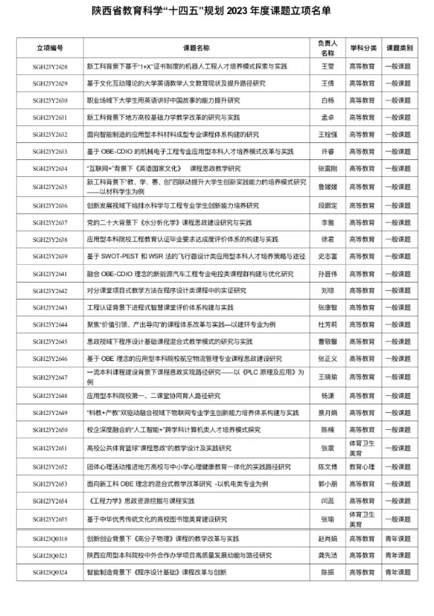 日前,陕西省教育科学规划领导小组下发《关于公布陕西省教育科学“十四五”规划 2023年度课题立项名单的通知》,beat365申报的“应用型本科院校第一二课堂协同育人路径研究”等31个项目获批立项,其中高教一般项目28项、青年专项3项。