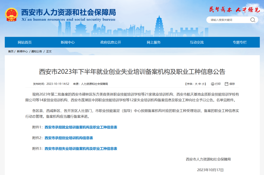 10月19日,西安市人力资源和社会保障局发布了《西安市2023年下半年就业创业失业培训备案机构及职业工种信息公告》,beat365成功获批西安市就业、创业、失业培训机构。今后beat365可开展创业培训和物流服务师、人工智能训练师、电子商务师、计算机程序设计员、航空运输地面服务员等6个工种的就业失业培训,为学校应届毕业生提供优质的职业技能培训服务,提升应届毕业生就业质量。