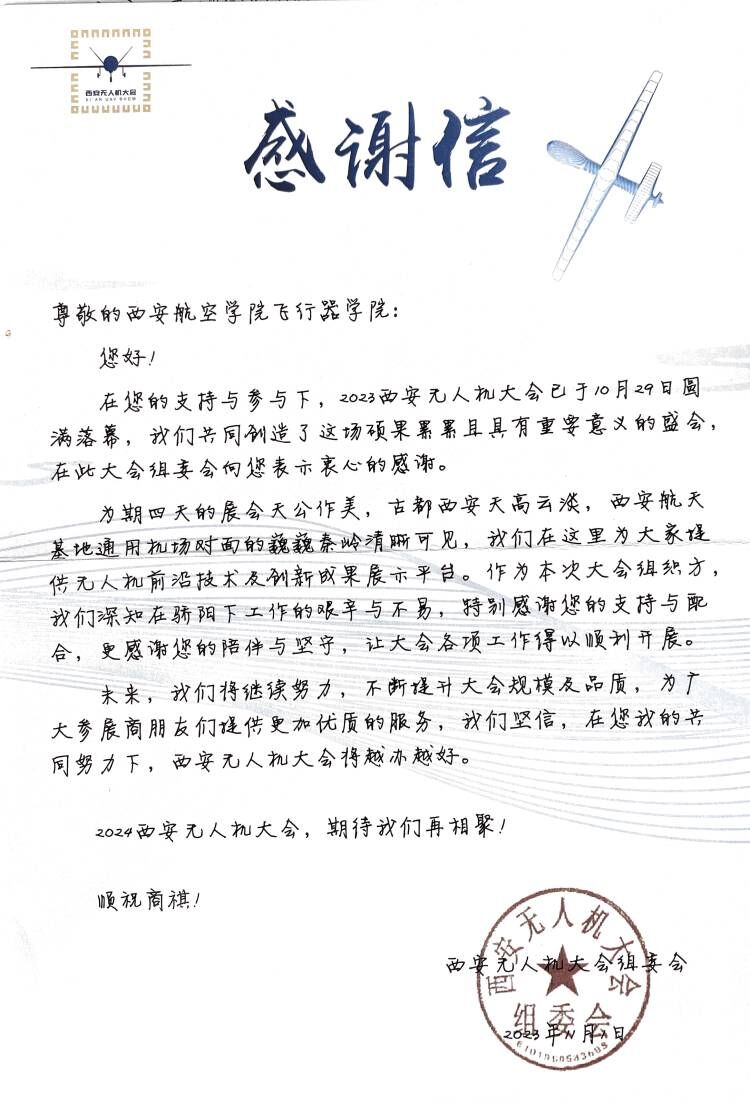 近日,我院收到来自2023西安无人机大会发来的感谢信。感谢我院对此次无人机大会的支持。