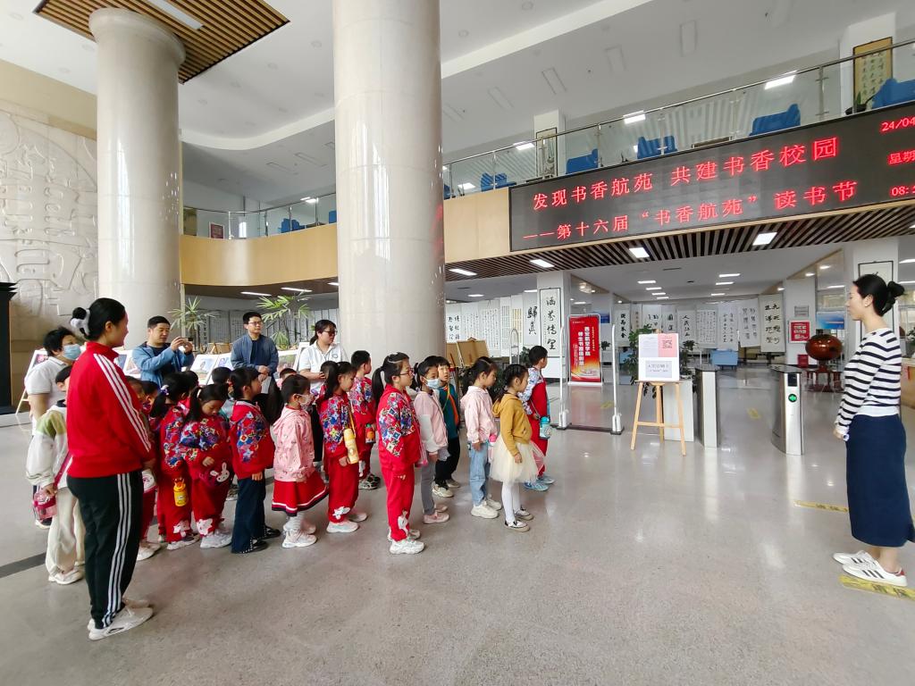 本次研学游活动得到了图书馆的大力支持并精心策划,整场活动由图书馆李慧老师主讲。孩子们在老师们的带领下,排着整齐的队伍,走进图书馆,置身于这充满墨香味的书海里。他们认真聆听李老师的讲解,有序参观了书画展区、图书阅览区、休闲阅读区、电子阅览区、书库、机房、图书借还台等。每到一处,李老师都极具亲和力地为孩子们讲解图书借阅流程、阅读注意事项、歌德机的操作、图书的分类、书架排列规律、馆藏书量等,让孩子们身临其境地感受图书馆的学习环境以及书卷之香,体验图书文化的魅力。到了图书馆二楼,孩子们体验了现场阅读,宽敞明亮的阅览区、琳琅满目的书籍、安静舒适的阅读环境让爱书的孩子们兴奋不已,他们找到了自己喜欢的图书,三五一群围坐在阅读桌旁,静静的看起书来,沉浸在文字图画的世界里,吸取知识的养分。