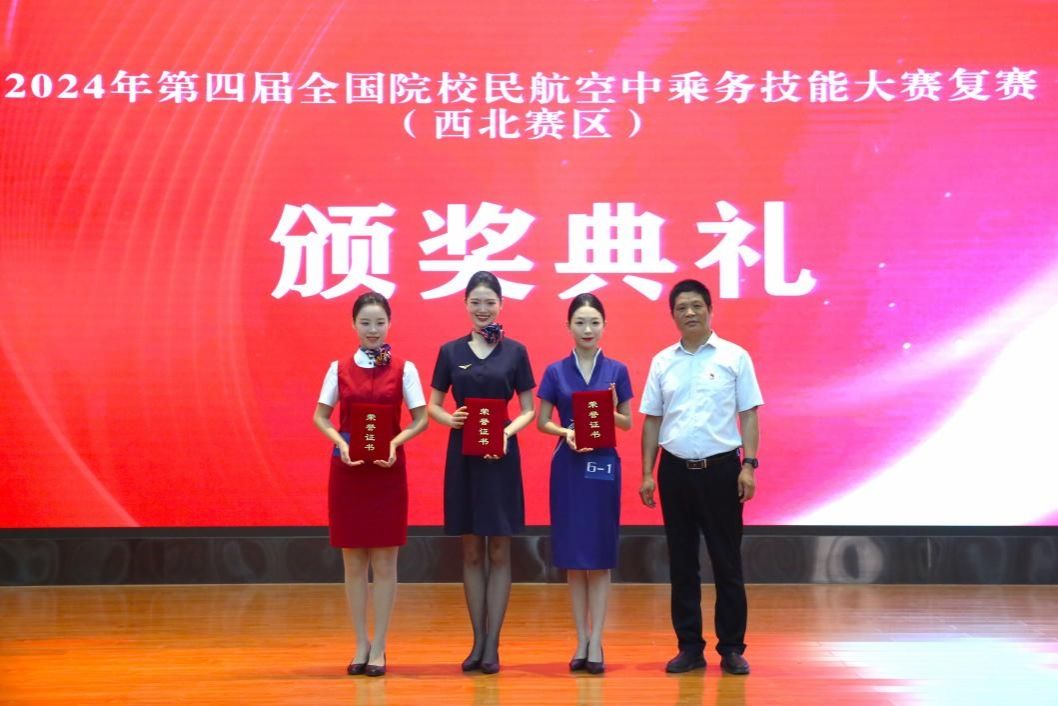 大赛共有来自西北五省8所院校代表队、48名选手参赛,经过三天的激烈比拼,共产生了2个团体一等奖、3个团体二等奖、3个团体三等奖和14个单项奖。民航学院参赛代表队荣获了大赛团体二等奖,李亚茹荣获个人综合表现二等奖、季舒荣获机上广播单项第一名。