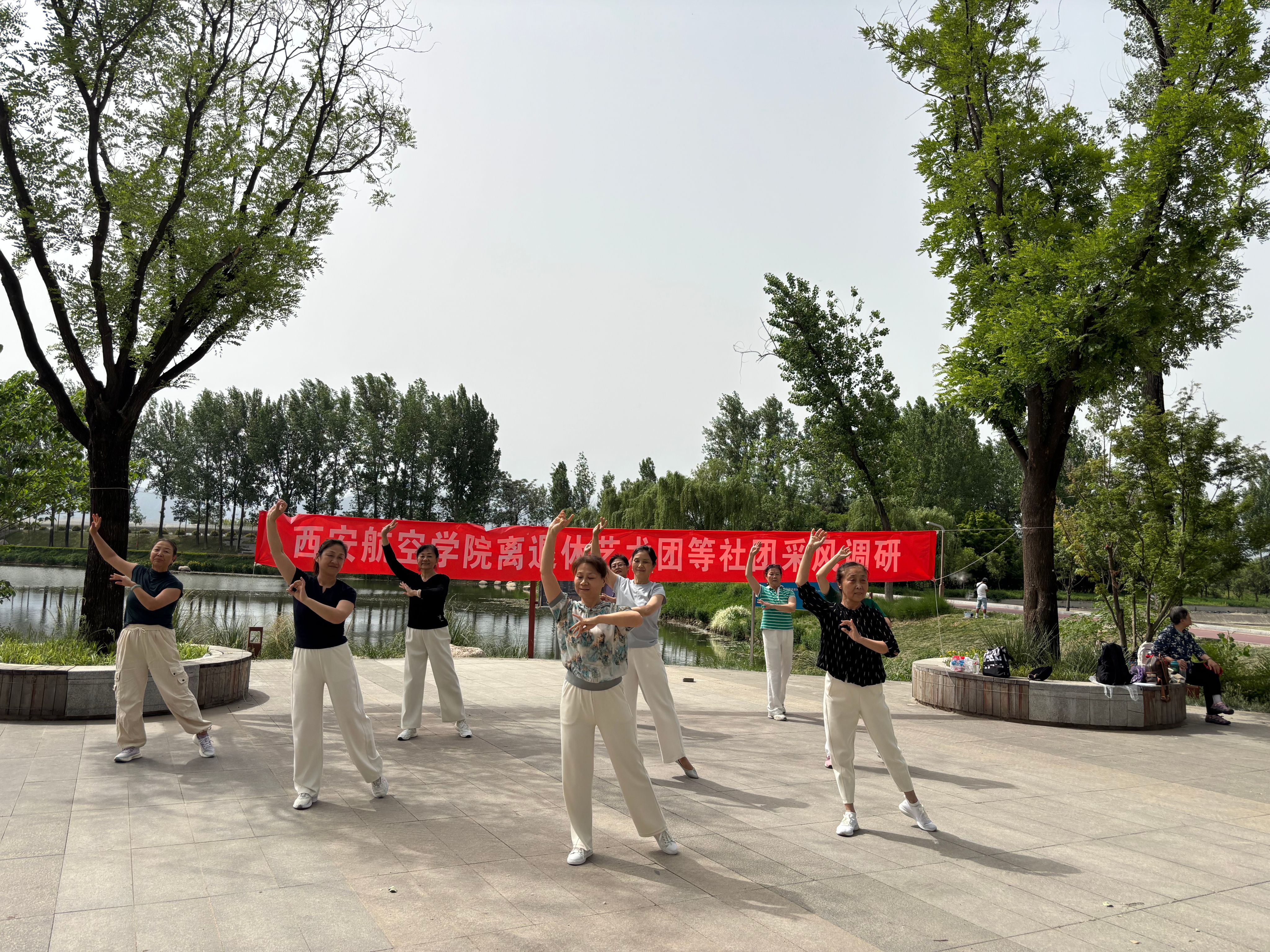 采风现场,离退休艺术团的大合唱《阳光路上》、《夕阳红》为文化采风活动拉开了帷幕,接续表演的《手风琴》独奏,艺术团舞蹈队表演了串烧舞,女生小合唱《妈妈教我一支歌》、《相遇》,柔力球社团的健美操《各族儿女心向党》以及太极拳社团带来的《32式太极拳》等节目相继登场,仪祉湖畔的波光中舞步身姿轻盈,动作舒缓流畅,细腻的歌声与真挚的情感,展现着老同志们热爱美好生活、畅享美好未来别样的艺术魅力。