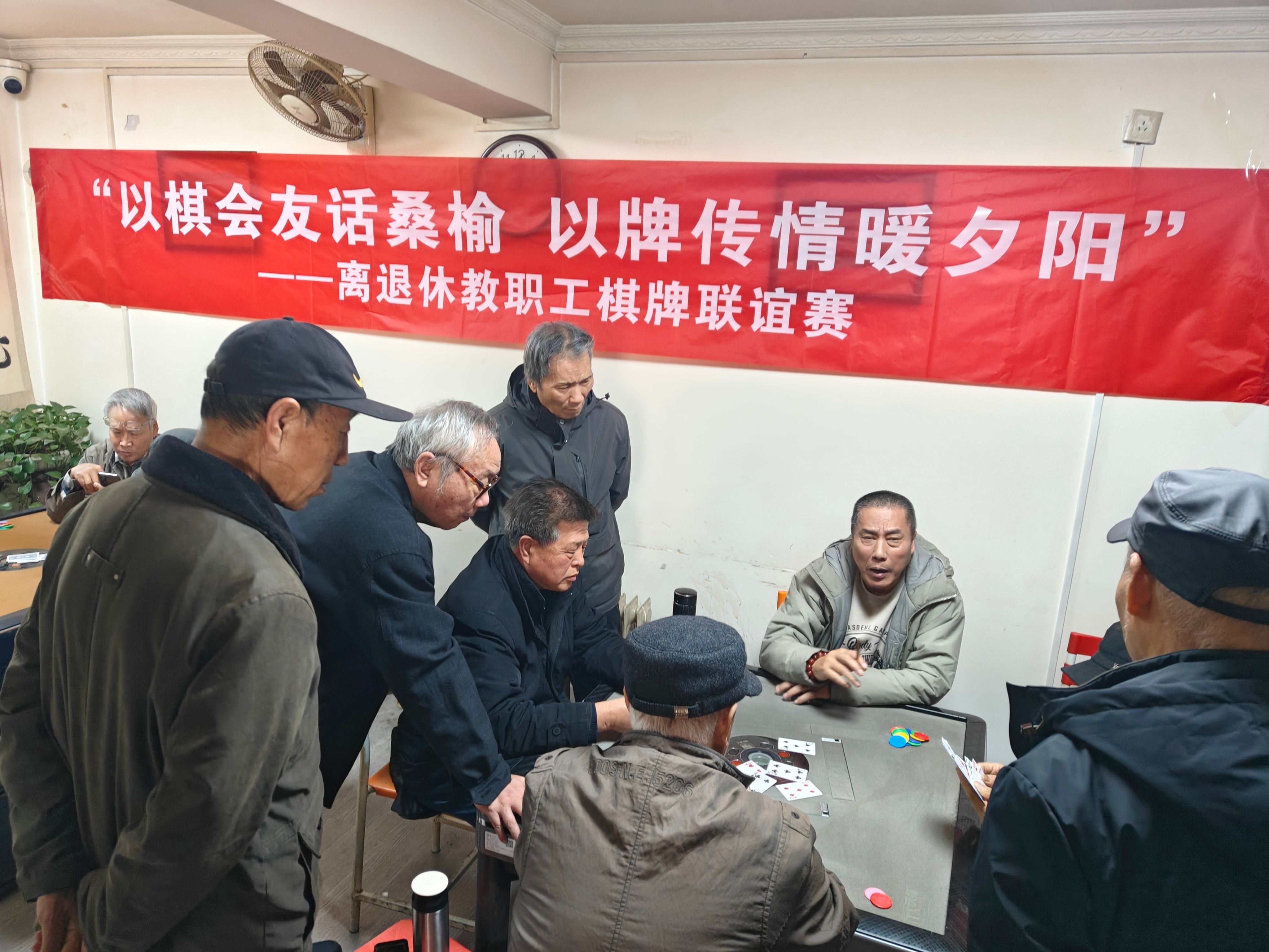 联谊赛的现场,象棋博弈硝烟隐现,老同志们或屏息凝神、谨慎布局,或果断出击、妙招频现,在楚河汉界间展现智慧与沉稳;扑克“挖坑”赛场则轻松活泼,搭档配合默契,笑声与讨论声此起彼伏。大家在竞技中切磋技艺,在交流中分享心得,联谊赛搭建情感桥梁,现场其乐融融,洋溢着欢声笑语,让“桑榆之年”满溢温情。老同志们纷纷表示,活动趣味乐趣不断,不仅让思维“动起来”,更让同事间的情谊“热起来”,切实感受到了学校的关怀与温暖。