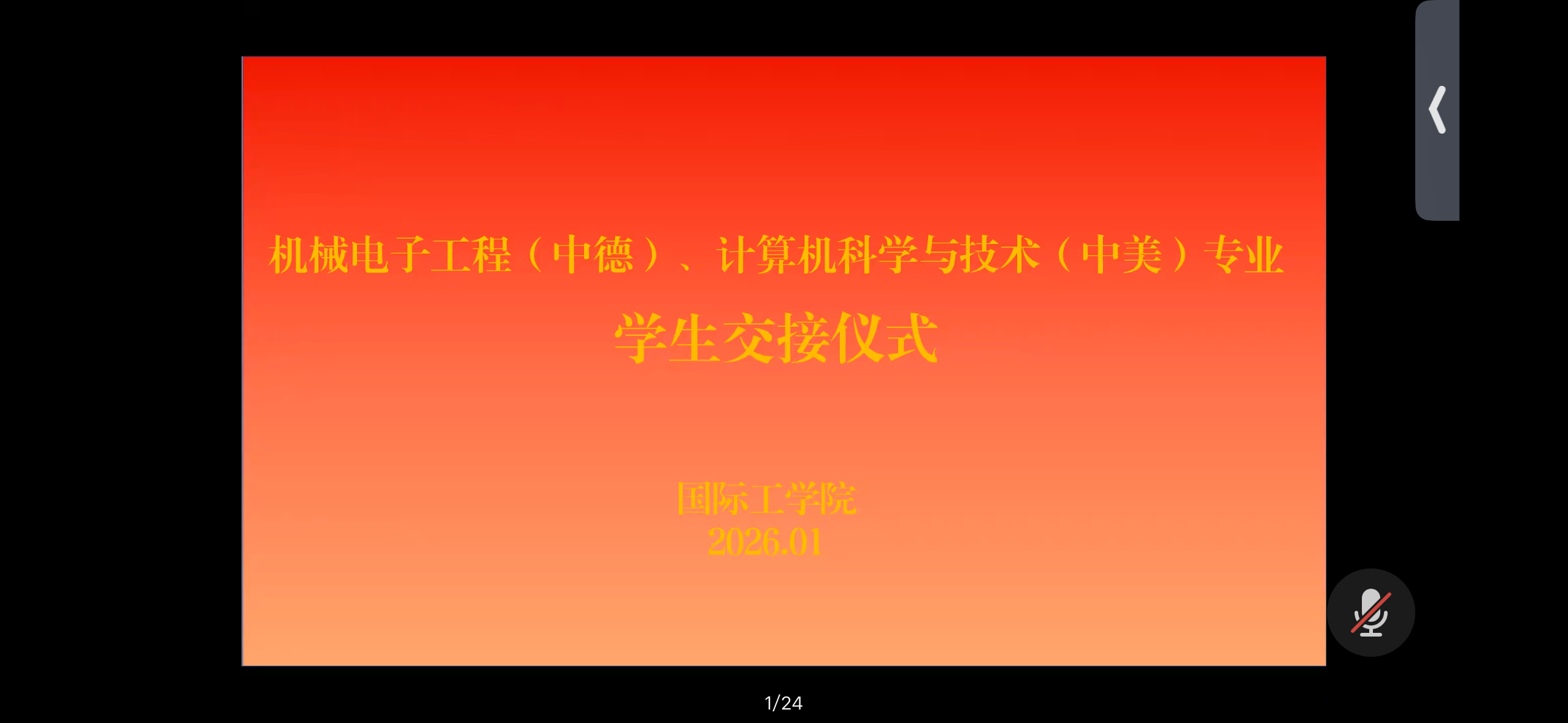 1月30日,国际工学院(怀卡托学院)与航空制造与车辆工程学院、计算机与人工智能学院,联合开展机械电子工程(中德班)和计算机科学与技术(中美班)线上交接及见面会。会议由计算机与人工智能学院学工办副主任侯勇主持,国际工学院直属党支部书记关长平、副院长张琛、计算机与人工智能学院党委书记李中、航空制造与车辆工程学院党委副书记刘欣,国际工学院全体教职工以及涉及转接工作的学工办主任、辅导员、全体学生参加了会议。