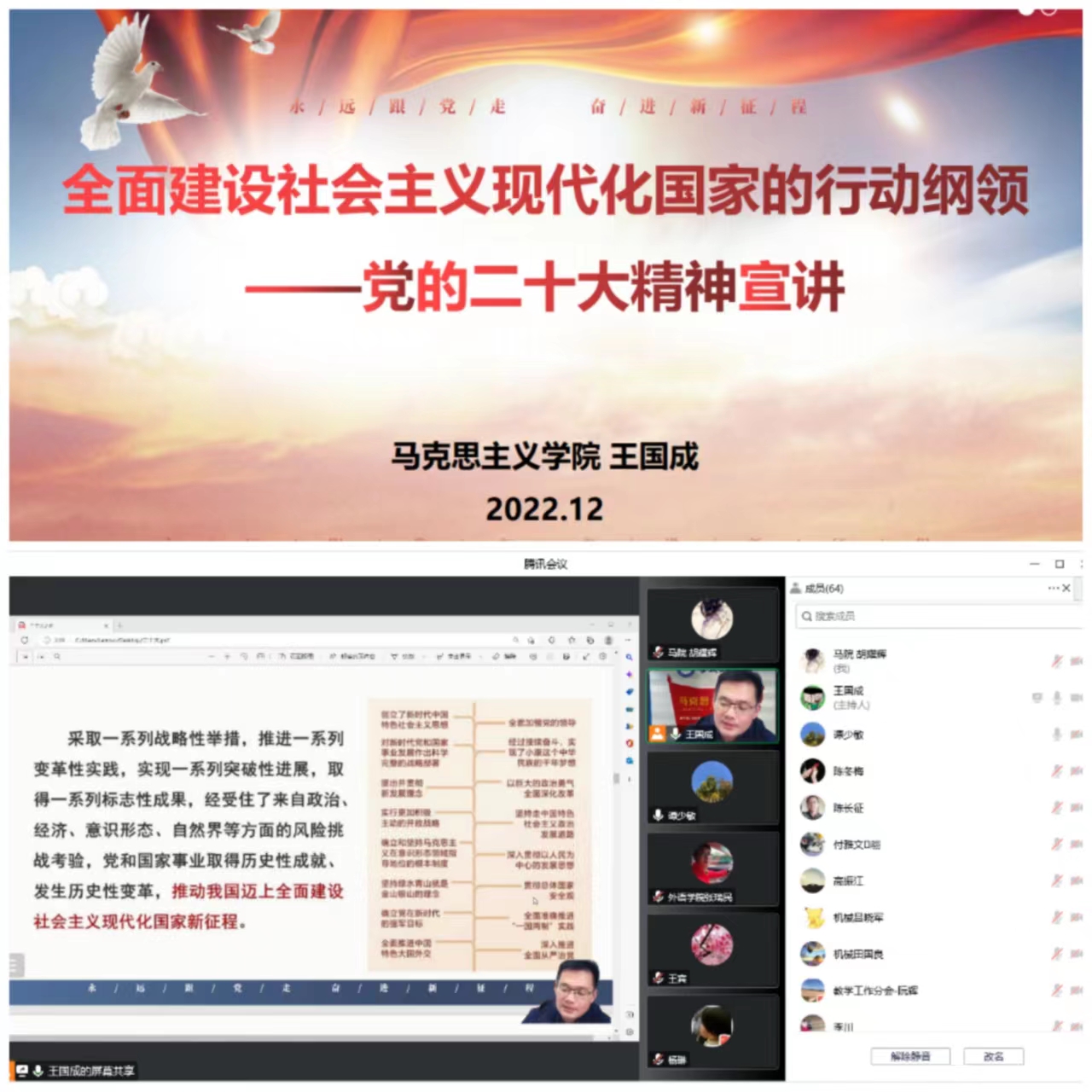 12月8日,邀请马克思主义学院王国成副教授做题为“全面建设社会主义现代化国家的行动纲领——党的二十大精神解读”报告,报告从新时代十年成就推动我国迈上新征程、新时代新征程面临的机遇和挑战、开辟马克思主义中国化时代化新境界、以中国式现代化全面推进中华民族伟大复兴、以党的自我革命引领社会革命等方面对二十大精神进行了全面解读。报告内容深入浅出,宣讲党的百年奋斗历程特别是党的十八大以来新时代十年的伟大变革,教育引导广大职工群众深刻理解党的二十大对全面建设社会主义现代化国家作出的战略部署,切实把思想和行动统一到党中央精神上来。