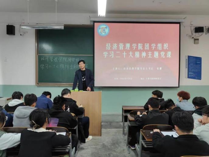 4月7日,经济管理学院党总支书记张鹏在教学楼808教室为团学组织开展了“学习二十大精神”主题党课。张鹏指出,党的二十大报告,不仅是对党的十八大以来工作的总结与回顾,更是对未来党和国家事业和目标的蓝图设计与规划。他带领大家回顾了建党以来的马克思主义中国化理论成果介绍了“双碳经济”等最新社会热点;他希望青年学子要对党的政策和国之大者做到心中有数,鼓励大家增强“四个意识”、坚定“四个自信”,做到“两个维护”。