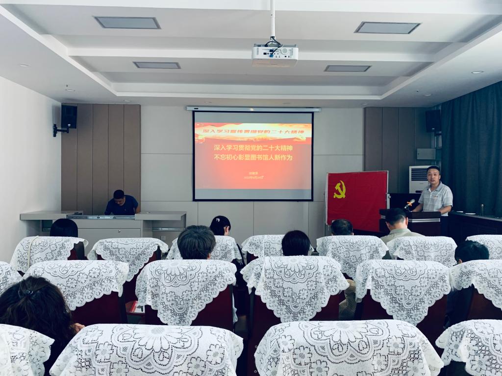 随后,图书馆直属党支部书记赵建涛讲授了题为“深入学习贯彻党的二十大精神 不忘初心彰显图书馆人新作为”专题党课。他立足中国共产党是什么、要干什么这个根本问题,阐述中国共产党历史使命和行动价值,分享学习贯彻党的二十大精神的心得体会,并对新时代图书馆人善作为提出了具体要求。