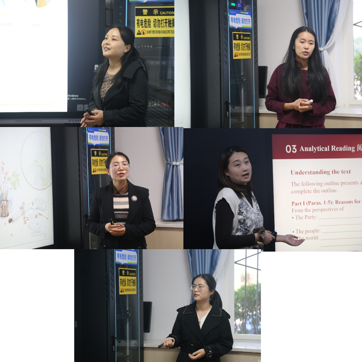 参加比赛的五名教师依据课程特点,利用PPT、短视频等方式从主题选取、课程导入、内容选择、课件设计等方面进行了精心编排,深入挖掘课程蕴含的思想政治教育元素和所承载的思想政治教育功能。参赛教师课堂各具特色,实现“知识传授”和“价值引领”有机统一,展示了各自的教学风采。 激烈角逐,学院将推选张茜楠和徐芳两名教师参加校级决赛。